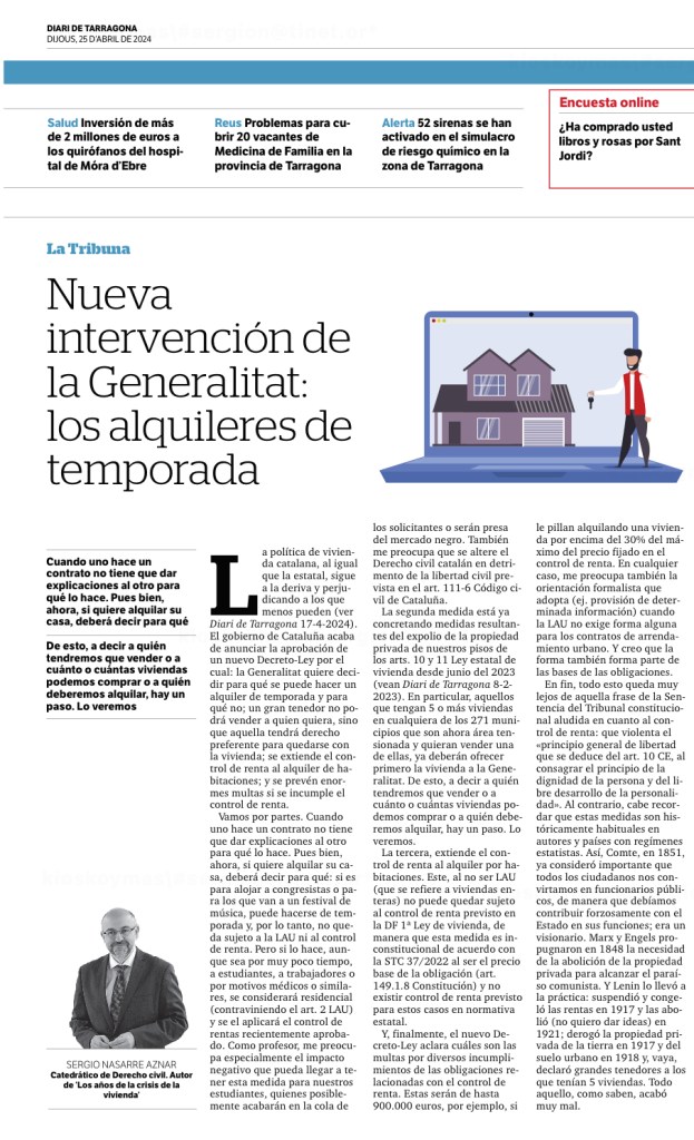 Opinión Opinión. Nueva intervención de la Generalitat: los alquileres de temporada. 25 de abril de 2024 Sergio Nasarre Aznar Deja un comentario Diari de Tarragona 25-4-2024. Puede leerse también formato digital aquí.