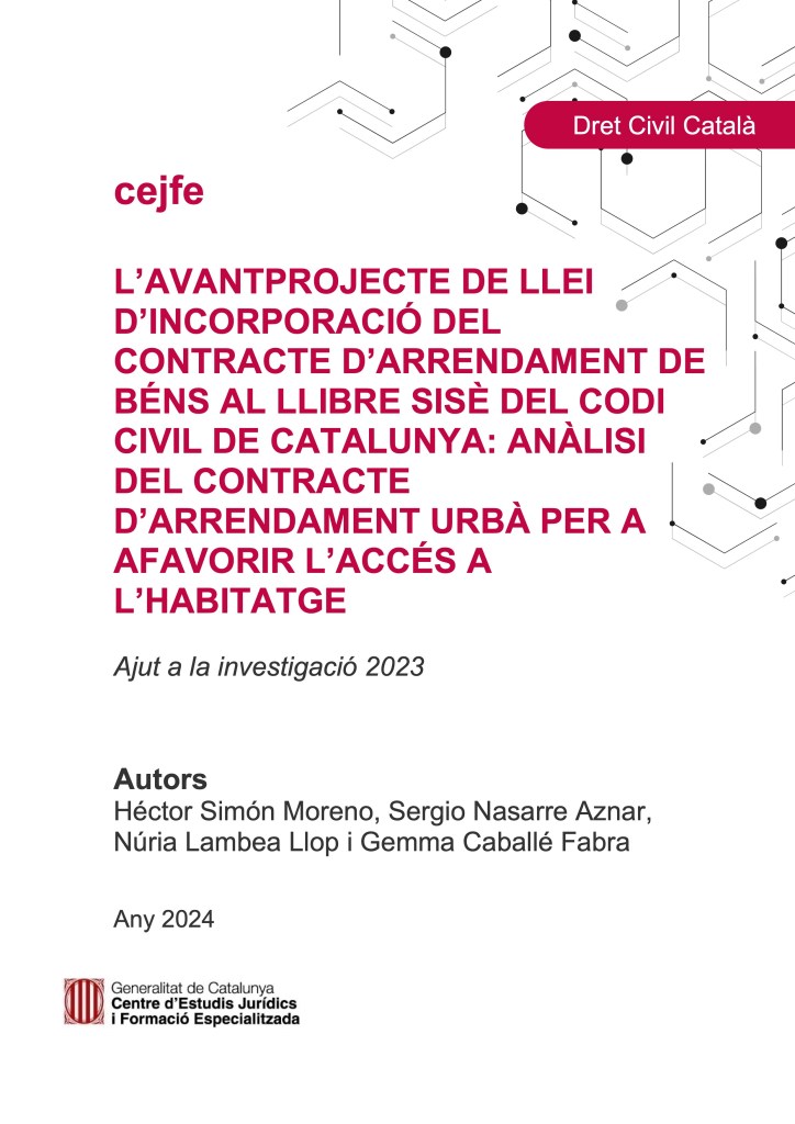 “El Anteproyecto de ley de incorporación del contrato de arrendamiento de bienes en el libro sexto del Código Civil de Cataluña: análisis del contrato de arrendamiento urbano para favorecer el acceso a la vivienda”, Centro de Estudios Jurídicos y Formación Especializada, Generalidad de Cataluña. Disponible a texto completo aquí.