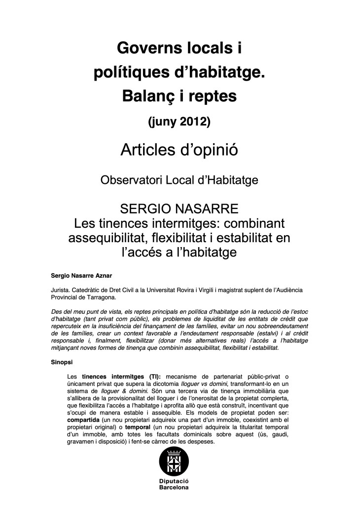 S. Nasarre Aznar, “Les tinences intermitges: combinant assequibilitat, flexibilitat i estabilitat en l’accés a l’habitatge”, Articles d’opinió, Observatorio Local de la Vivienda, Diputació de Barcelona.