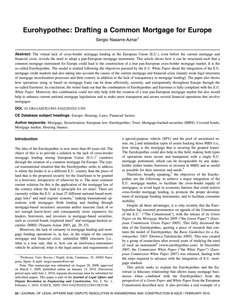 S. Nasarre Aznar, “Eurohypothec: drafting a common mortgage for Europe”, Journal of Legal Affairs and Dispute Resolution in Engineering and Construction (Estados Unidos), febrero 2010, Vol. 2, Issue 1.