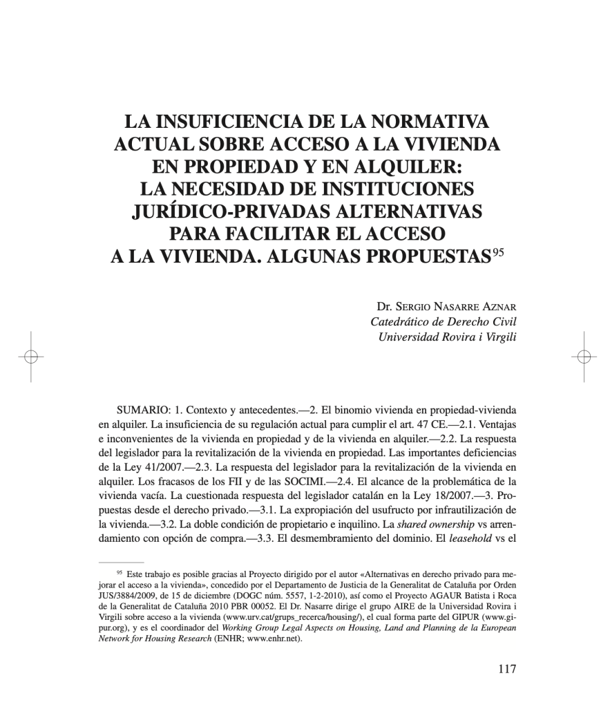 S. Nasarre Aznar, “La insuficiencia de la normativa actual sobre acceso a la vivienda en propiedad y en alquiler: la necesidad de instituciones jurídico-privadas alternativas para facilitar el acceso a la vivienda. Algunas propuestas”, en NASARRE AZNAR, Sergio (dir.), “El acceso a la vivienda en un contexto de crisis”, Ed. Edisofer, 2011, pp. 117 a 172.