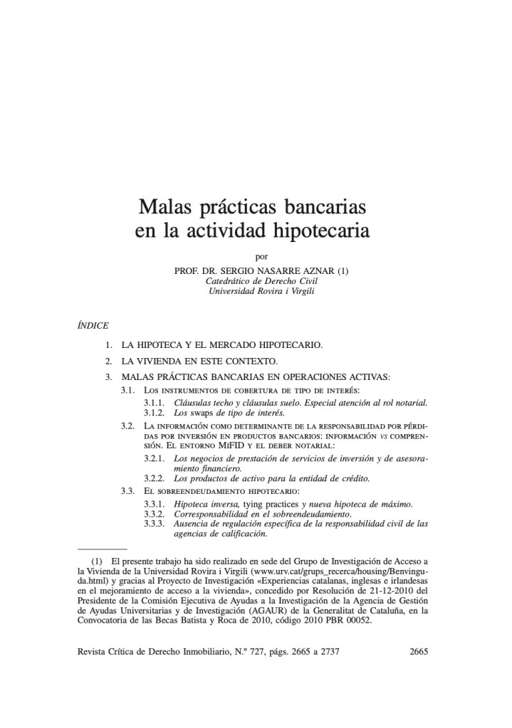 Sergio Nasarre Aznar, “Malas prácticas bancarias en la actividad hipotecaria”, Revista Crítica de Derecho Inmobiliario, núm. 727, 2011, pp. 2665 a 2737. Texto completo disponible aquí.