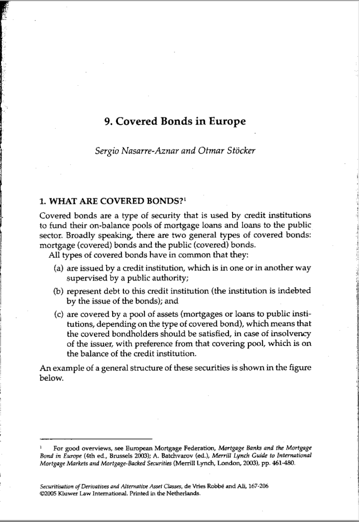 S. Nasarre y O. Stöcker, Covered bonds in Europe (“Bonos garantizados en Europa”) en “Securitisation of derivatives and alternative asset classes. Yearbook 2005”, Jan Job de Vries Robbé and Paul Ali (coords.), The Hague, 2005, Ed. Kluwer Law International, pp. 167-206