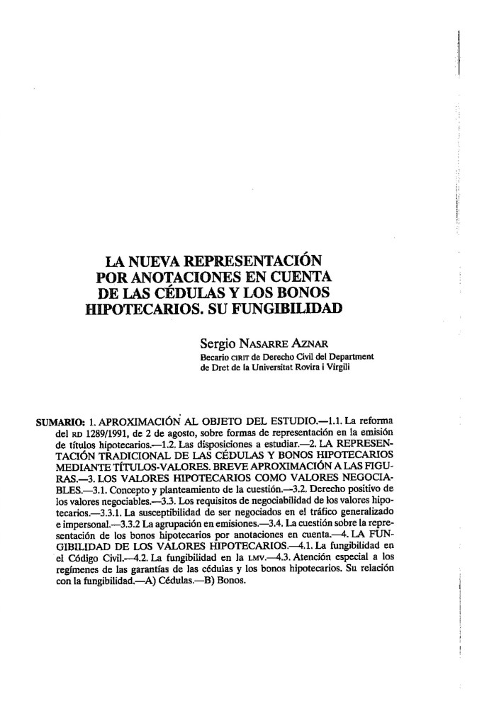 S. Nasarre Aznar, “La nueva representación por anotaciones en cuenta de las cédulas y los bonos hipotecarios. Su fungibilidad”. Libro: Contratación bancaria. Jornadas celebradas en Tarragona, 6 y 7 de marzo de 1997, 1998, Madrid y Barcelona. Ed. Marcial Pons y Universidad Rovira i Virgili.