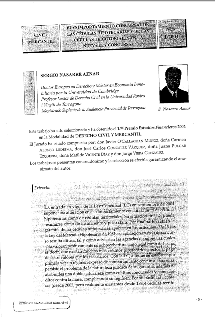 S. Nasarre Aznar, “Die aktuelle Situation des Schutzes der spanischen Cédulas Hipotecarias nach dem neuen Insolvenzgesetz von 2003” (La situación actual de la protección de las cédulas hipotecarias españolas tras la nueva Ley Concursal de 2003), «Kredit Rating & Praxis» (Suiza), 2/2004, pp. 23 a 25.