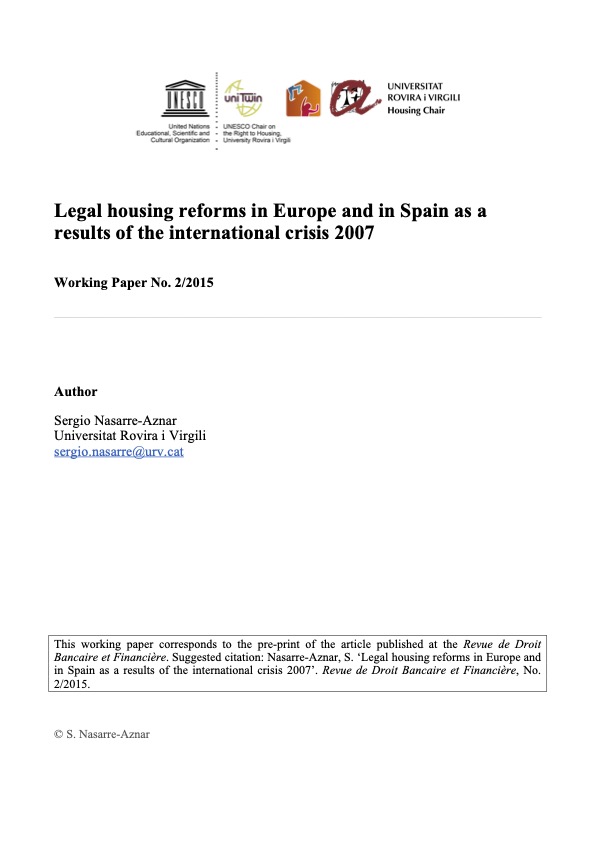 S. Nasarre-Aznar. «Legal housing reforms in Europe and in Spain as a results of the international crisis 2007». Revue de Droit Bancaire et Financière, No. 2/2015. Acceso completo.