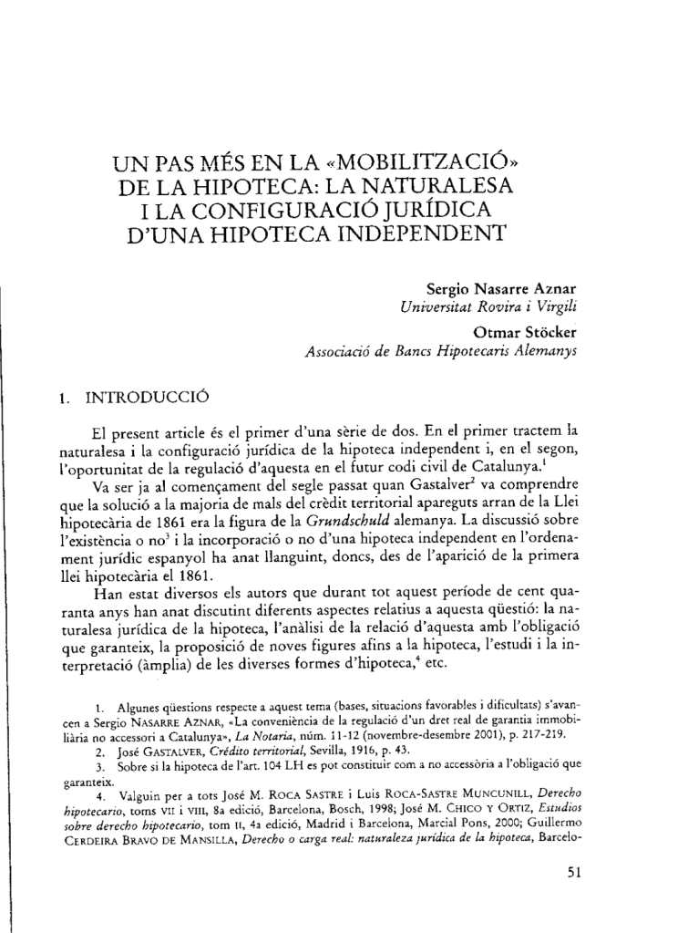 S. Nasarre y O. Stöcker, “Un pas més en la ‘mobilització’ de la hipoteca: la naturalesa i configuració jurídica d’una hipoteca independent” (Un paso más en la ‘mobilización’ de la hipoteca: la naturaleza y configuración jurídica de una hipoteca independiente), Revista catalana de dret privat, Vol. 1, 2002, pp. 51-79 (Parte 1) y Vol. 2, 2003, pp. 155 a 188 (Parte 2).