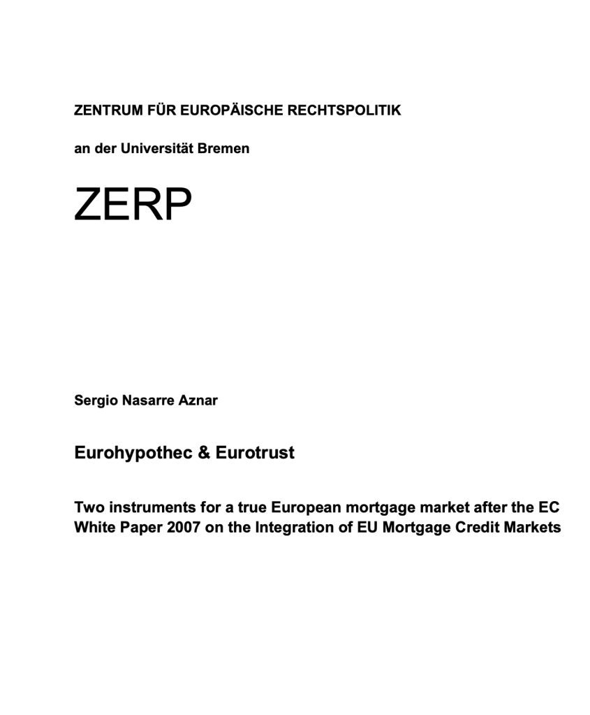 S. Nasarre Aznar, “Eurohypothec & Eurotrust. Two instruments for a true European mortgage market after the EC White Paper 2007 on the Integration of EU Mortgage Credit Markets”. Zentrum für Europäisches Rechtspolitik (ZERP), Universidad de Bremen. Diskussionpapier 7/2008, Bremen (Alemania), 2008.
