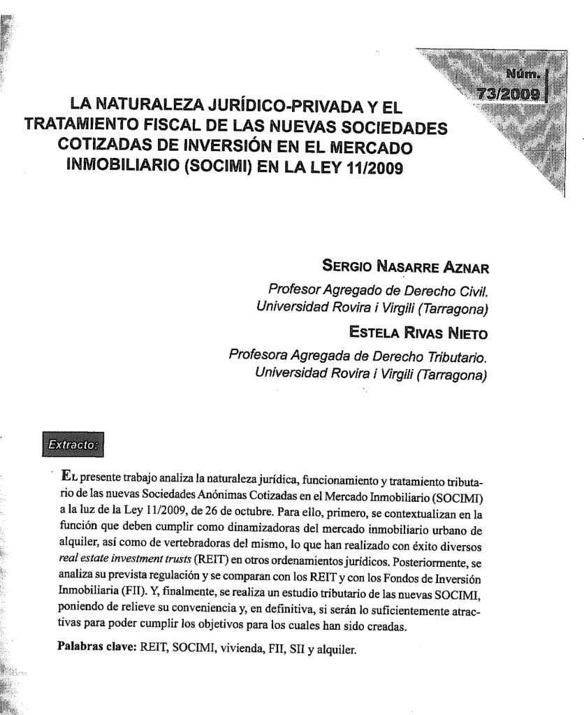 S. Nasarre y E. Rivas, Las nuevas SOCIMI: ¿Solución para el alquiler de vivienda en España?, “CEF-Legal”, núm. 105, octubre 2009, Centro de Estudios Financieros, pp. 15 a 80.