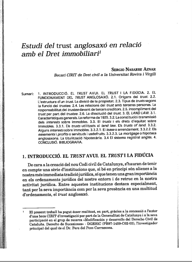 S. Nasarre Aznar, “Estudi del trust anglosaxó en relació amb el dret immobiliari” (Estudio del trust anglosajón en relación con el derecho inmobiliario). Libro: L’exercici de les competències sobre Dret Civil de Catalunya, Tirant lo Blanch, 2002, pp. 557-602.